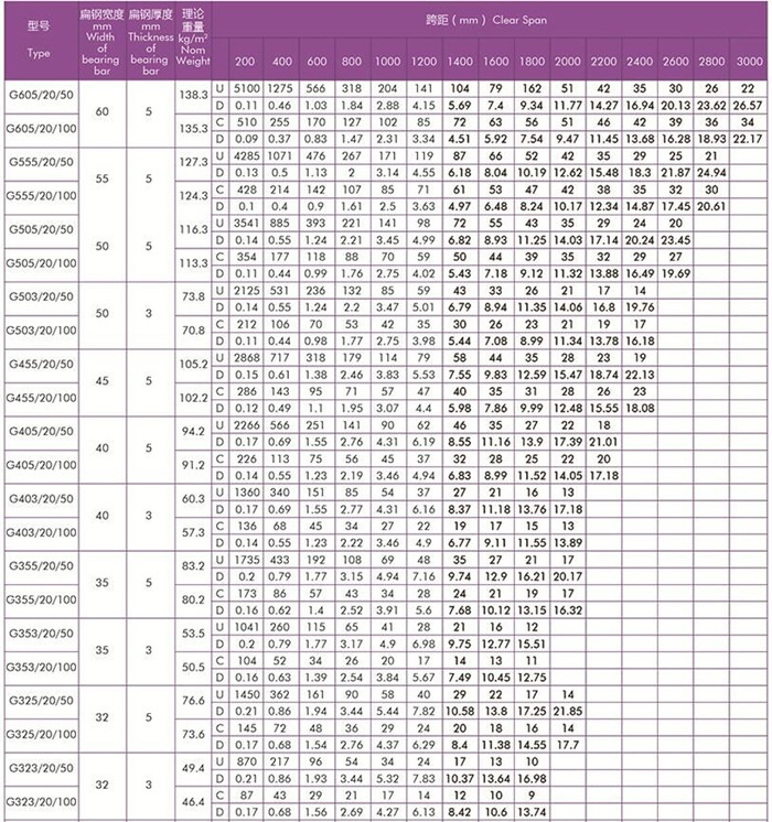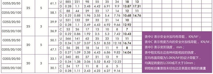 平面型扁鋼中心距為20常用鋼格板規(guī)格型號(hào)及安全荷載表