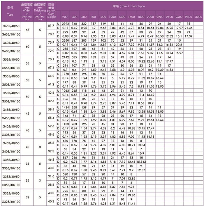 平面型扁鋼中心距為40常用鋼格柵板規(guī)格型號(hào)及安全荷載表
